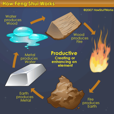 Cele cinci elemente ale Feng Shui se regăsesc deci în materialele din care este alcătuit habitatul. Acestea pot fi dispuse în mod constructiv, generând astfel o energie expansivă şi pozitivă, sau în mod distructiv, generând în acest caz o energie de contracţie, de rezistenţă.